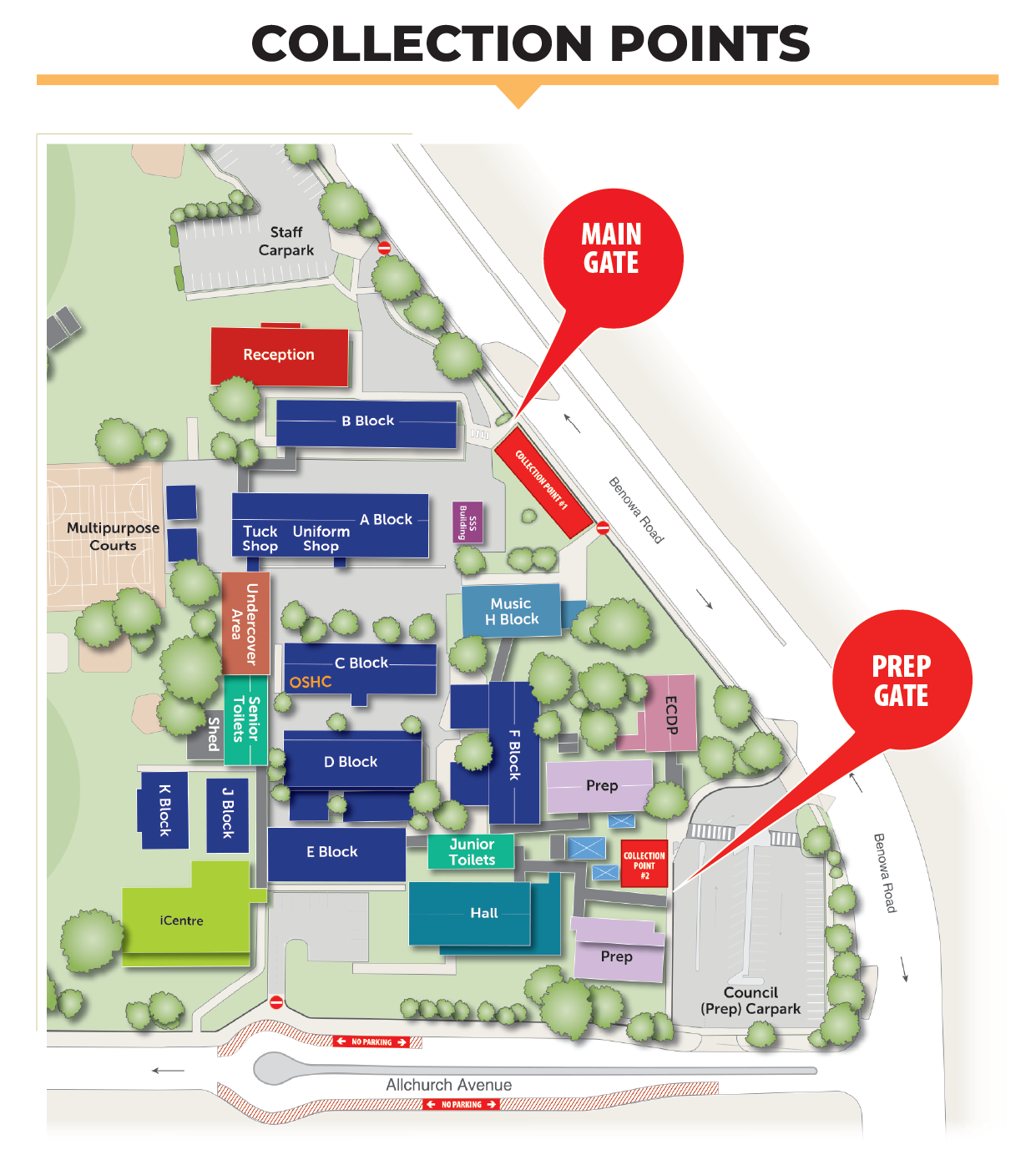 We provide supervision up until 3.20pm at the collection points indicated on the map. Delaying your pick-up until about 3.10pm significantly reduces congestion at 2.55pm when our bell sounds.