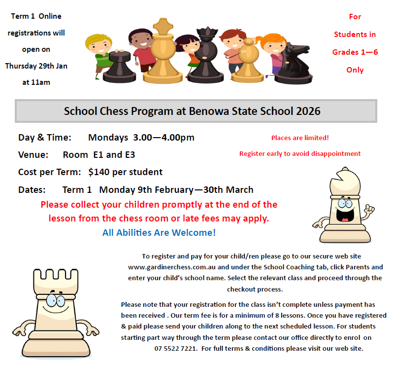 Chess if fun! Learn to play chess with professional Gardiner Chess coaches. Includes Gold Membership to chesskid.com with all term enrolments. Every Monday from 3pm - 4pm in Room E1 and E3Contact:Telephone: 5522 7221Email: info@gardinerchess.com.auWebsite: www.gardinerchess.com.au